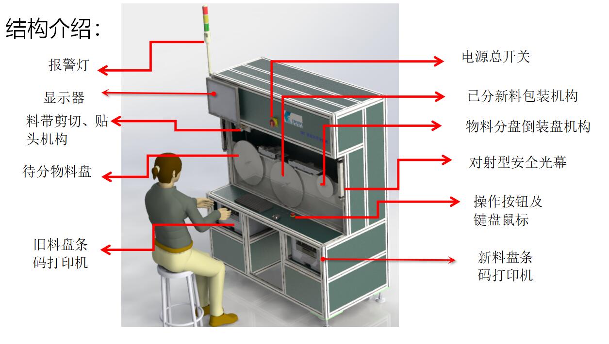 簡介: .通過料盤掃碼自動連接 MES 系統,核對并確定分料數量 .自動精確計數分盤 ,實現大盤料分小盤料,整數盤分定數盤 .自動包裝,減少人員依賴程度,減輕企業用工負擔。 .自動生成新條形碼打印張貼,便于識別與追溯,提高管理效率